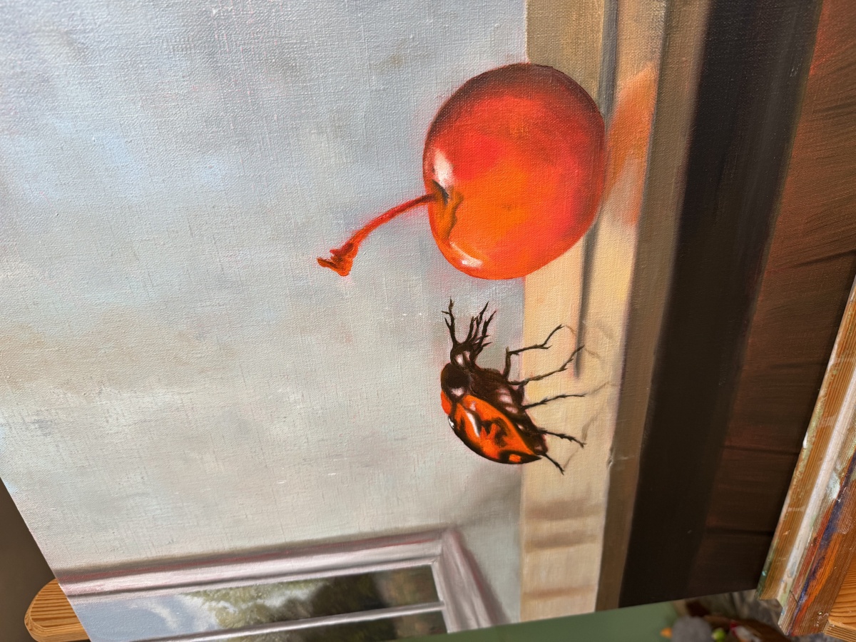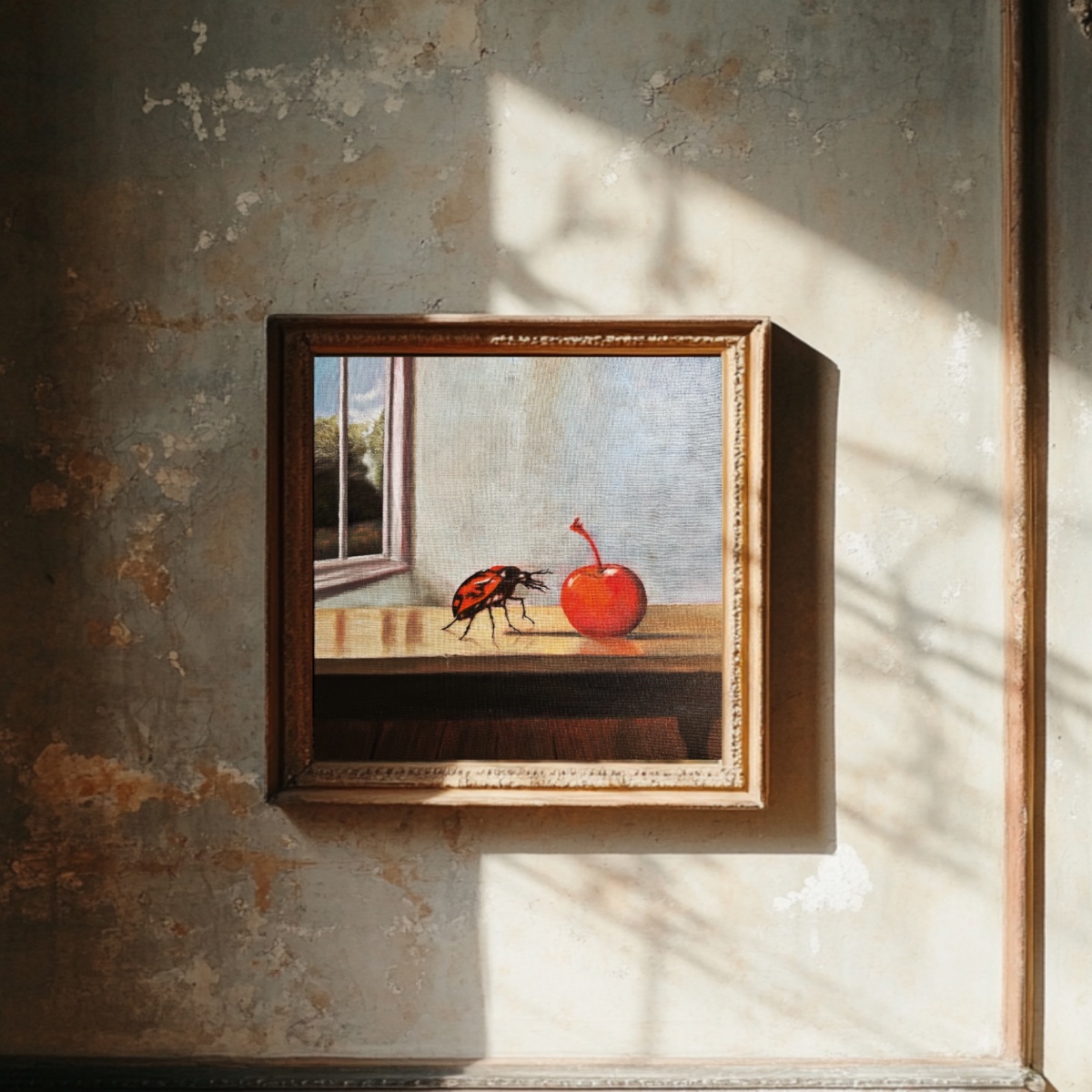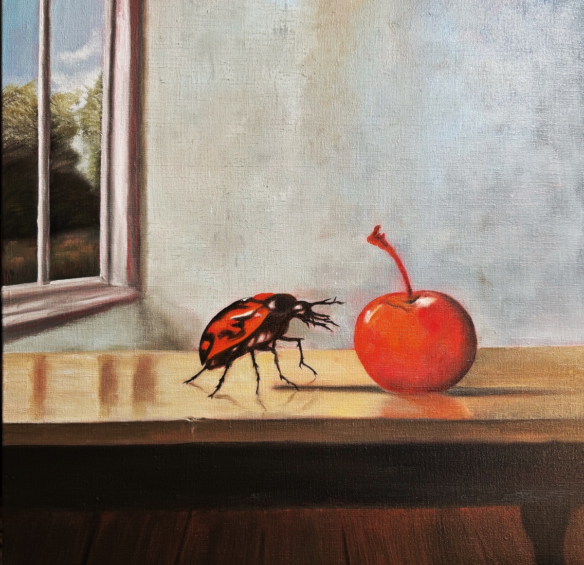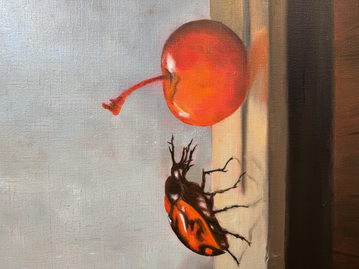 On an old wooden table, bearing the scars of all those years of ordinary life, lay a cherry. The only one, but perfect. It glistened in the afternoon light and smelled of summer, the kind of summer when you open the window wide and hear only the creaking of the boards and muffled sounds from somewhere in the yard. And just then, a bug set off on a journey across the table. A small, unhurried, somewhat funny traveler who stopped at the cherry, as if she saw the whole world in it. She didn't work, she didn't rush, she wasn't looking for anything big. It just followed the color, the scent, the quiet curiosity. Like us when we pause for a moment at something beautiful that has no reason to be so beautiful. At that moment, everything slowed down. Time sat down on the edge of the table, stopped ticking, and just quietly watched as the little creature approached the fruit that perhaps no one would eat. Maybe it's just lying there for that moment. For the memory of the years when we ate cherries straight from the branches and got sticky fingers. It was a completely ordinary moment — a cherry, a bug, a table. And yet there was something delicate and fleeting hidden in it. A reminder that even the smallest images of our day can be little celebrations. That beautiful things don't just happen on vacation, but also in the quiet of the kitchen, in the dust of a sunbeam, in the moment when a bug stops at a cherry and the world takes a different breath for a few seconds.